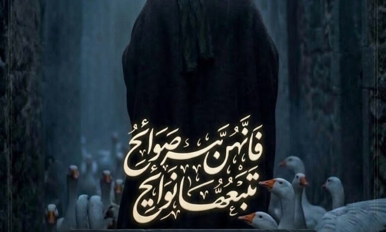 وكان لما خرج أمير المؤمنين من البيت إلى المسجد تبعه إوز كن في الدار فتعلقن بثوبه، فقال عليه السلام: “صوائح…