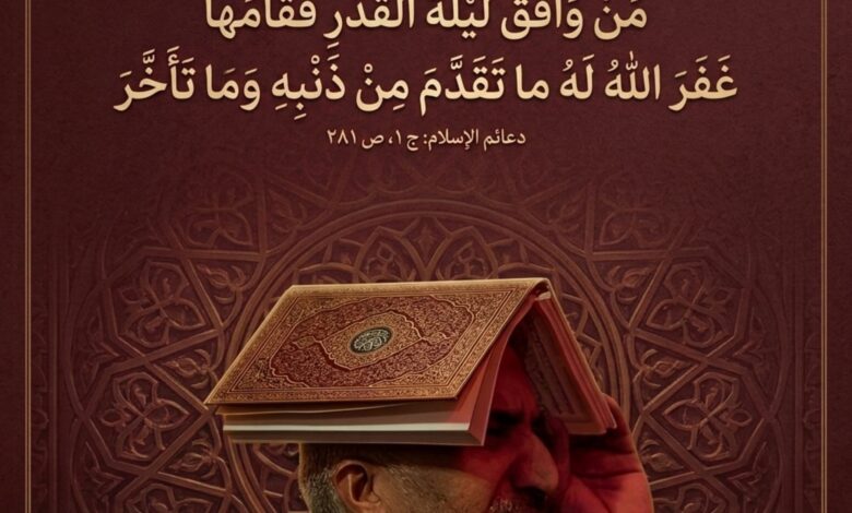 عَنِ النَّبِيِّ صَلَّى اللَّهُ عَلَيْهِ وَآلِهِ أَنَّهُ قَالَ: “مَنْ وَافَقَ لَيْلَةَ الْقَدْرِ فَقَامَها غَفَرَ اللهُ لَهُ مَا تَقَدَّمَ مِنْ ذَنْبِهِ…