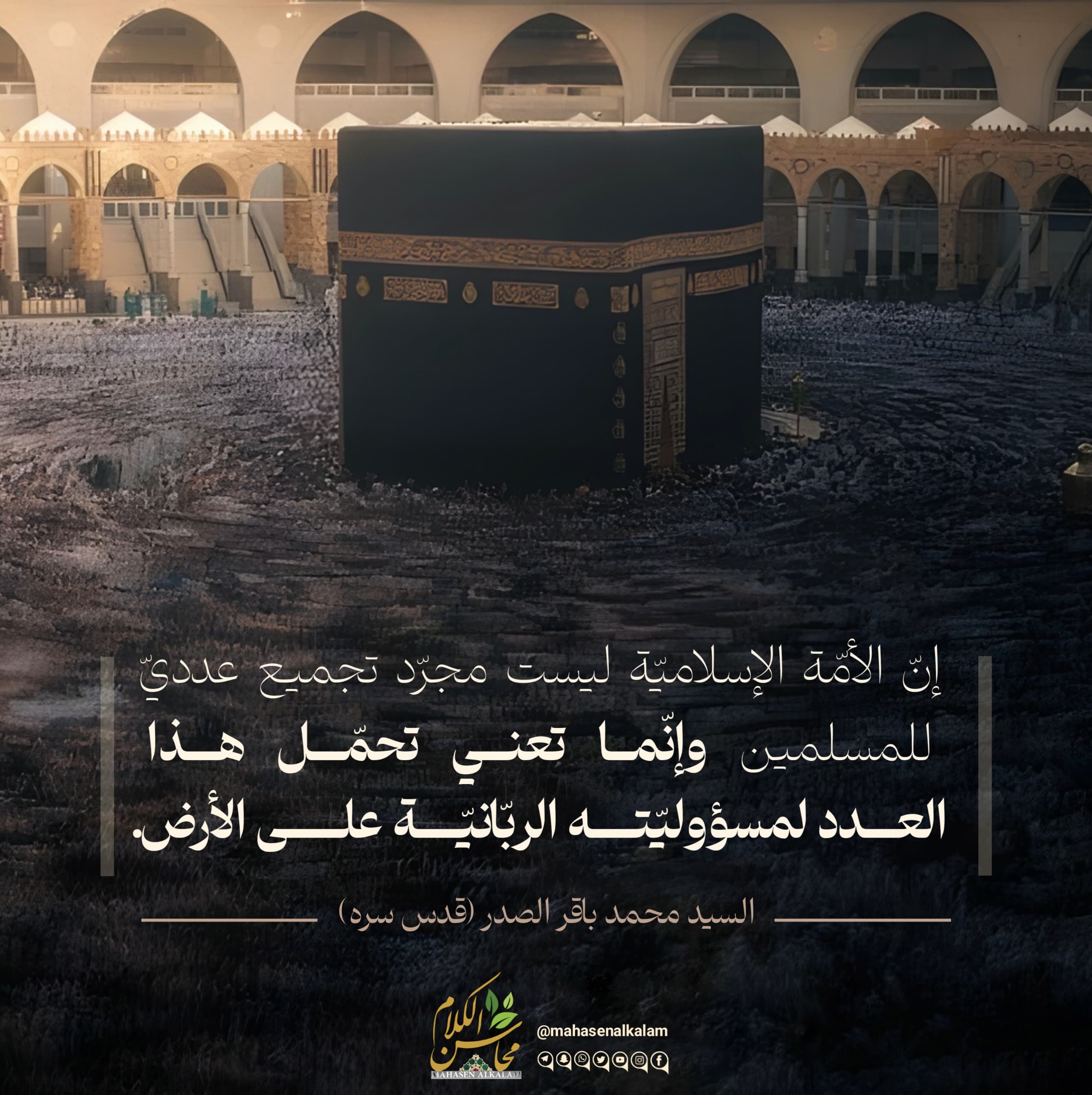 “إنّ الأمّة الإسلاميّة ليست مجرّد تجميع عدديّ للمسلمين وإنّما تعني تحمّل هذا العدد لمسؤوليّته الربّانيّة على الأرض”.