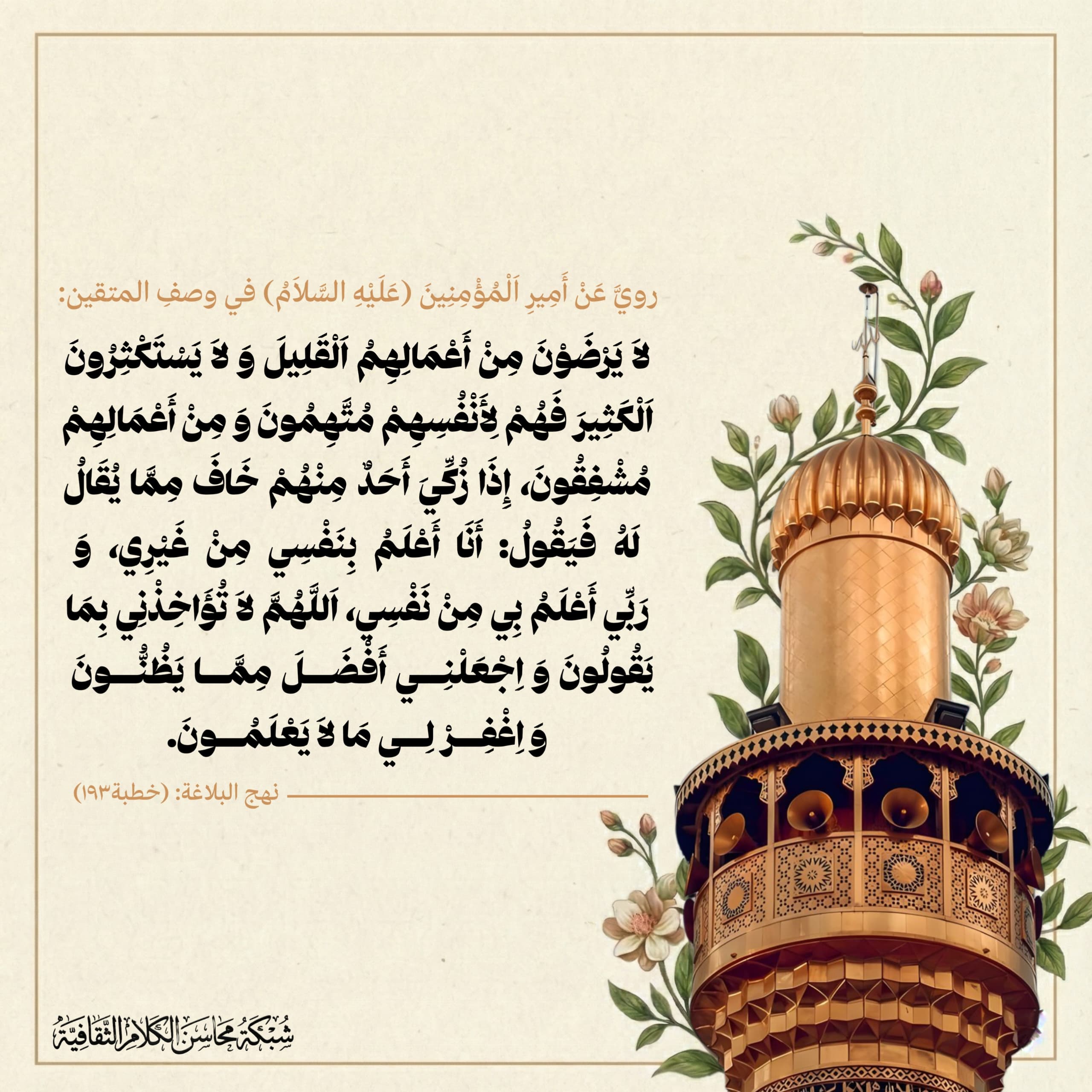 “لاَ يَرْضَوْنَ مِنْ أَعْمَالِهِمُ اَلْقَلِيلَ وَ لاَ يَسْتَكْثِرُونَ اَلْكَثِيرَ فَهُمْ لِأَنْفُسِهِمْ مُتَّهِمُونَ وَ مِنْ أَعْمَالِهِمْ مُشْفِقُونَ، إِذَا زُكِّيَ أَحَدٌ مِنْهُمْ خَافَ مِمَّا يُقَالُ لَهُ فَيَقُولُ: أَنَا أَعْلَمُ بِنَفْسِي مِنْ غَيْرِي، وَ رَبِّي أَعْلَمُ بِي مِنْ نَفْسِي، اَللَّهُمَّ لاَ تُؤَاخِذْنِي بِمَا يَقُولُونَ وَ اِجْعَلْنِي أَفْضَلَ مِمَّا يَظُنُّونَ وَ اِغْفِرْ لِي مَا لاَ يَعْلَمُونَ.”