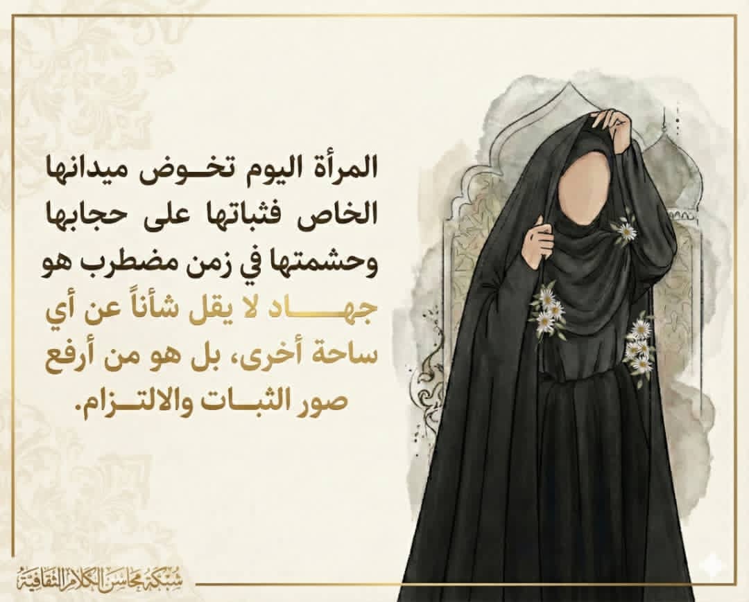 “المرأةُ اليوم تخوضُ ميدانها الخاص؛ فثباتُها على حجابها وحشمتها في زمنٍ مضطرب هو جهادٌ لا يقلُّ شأناً عن أي ساحة أخرى، بل هو من أرفع صور الثبات والالتزام.”