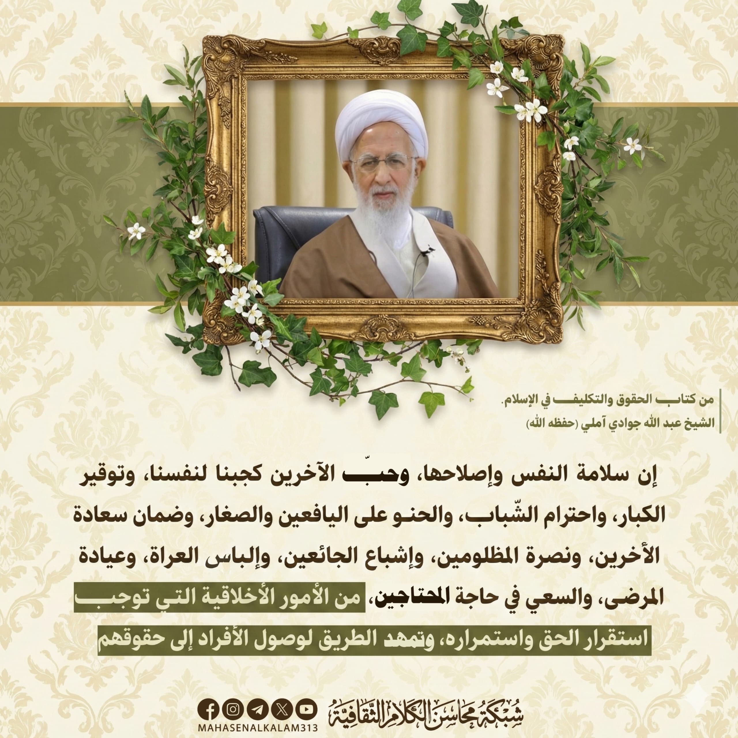 «إن سلامة النفس وإصلاحها، وحبّ الآخرين كحبنا لنفسنا، وتوقير الكبار، واحترام الشباب، والحنو على اليافعين والصغار، وضمان سعادة الآخرين، ونصرة المظلومين، وإشباع الجائعين، وإلباس العراة، وعيادة المرضى، والسعي في حاجة المحتاجين، من الأمور الأخلاقية التي توجب استقرار الحق واستمراره، وتمهد الطريق لوصول الأفراد إلى حقوقهم».