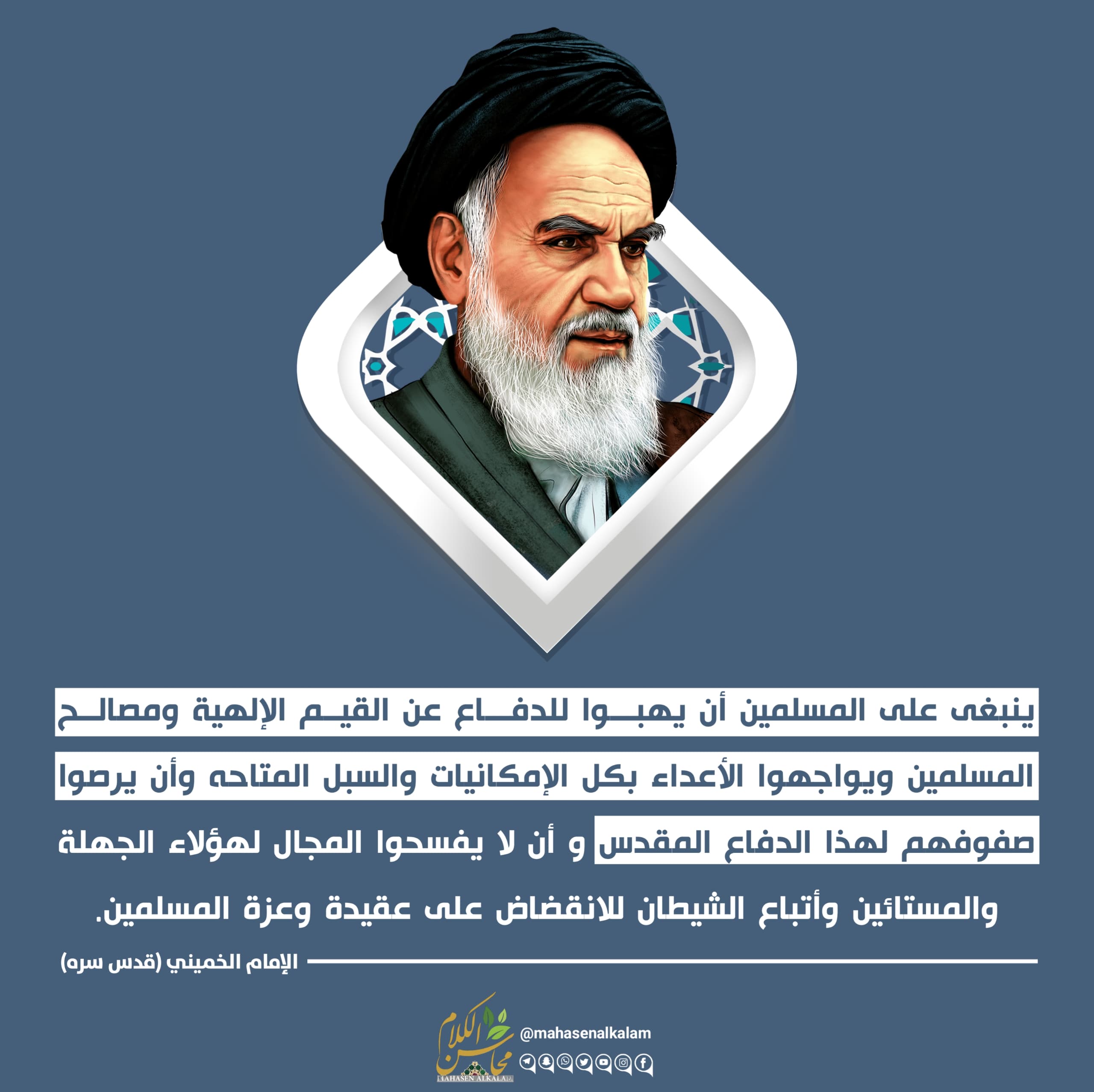 “ينبغى على المسلمين أن يهبوا للدفاع عن القيم الإلهية ومصالح المسلمين ويواجهوا الأعداء بكل الإمكانيات والسبل المتاحه وأن يرصوا صفوفهم لهذا الدفاع المقدس و أن لا يفسحوا المجال لهؤلاء الجهلة والمستائين وأتباع الشيطان للانقضاض على عقيدة وعزة المسلمين.”