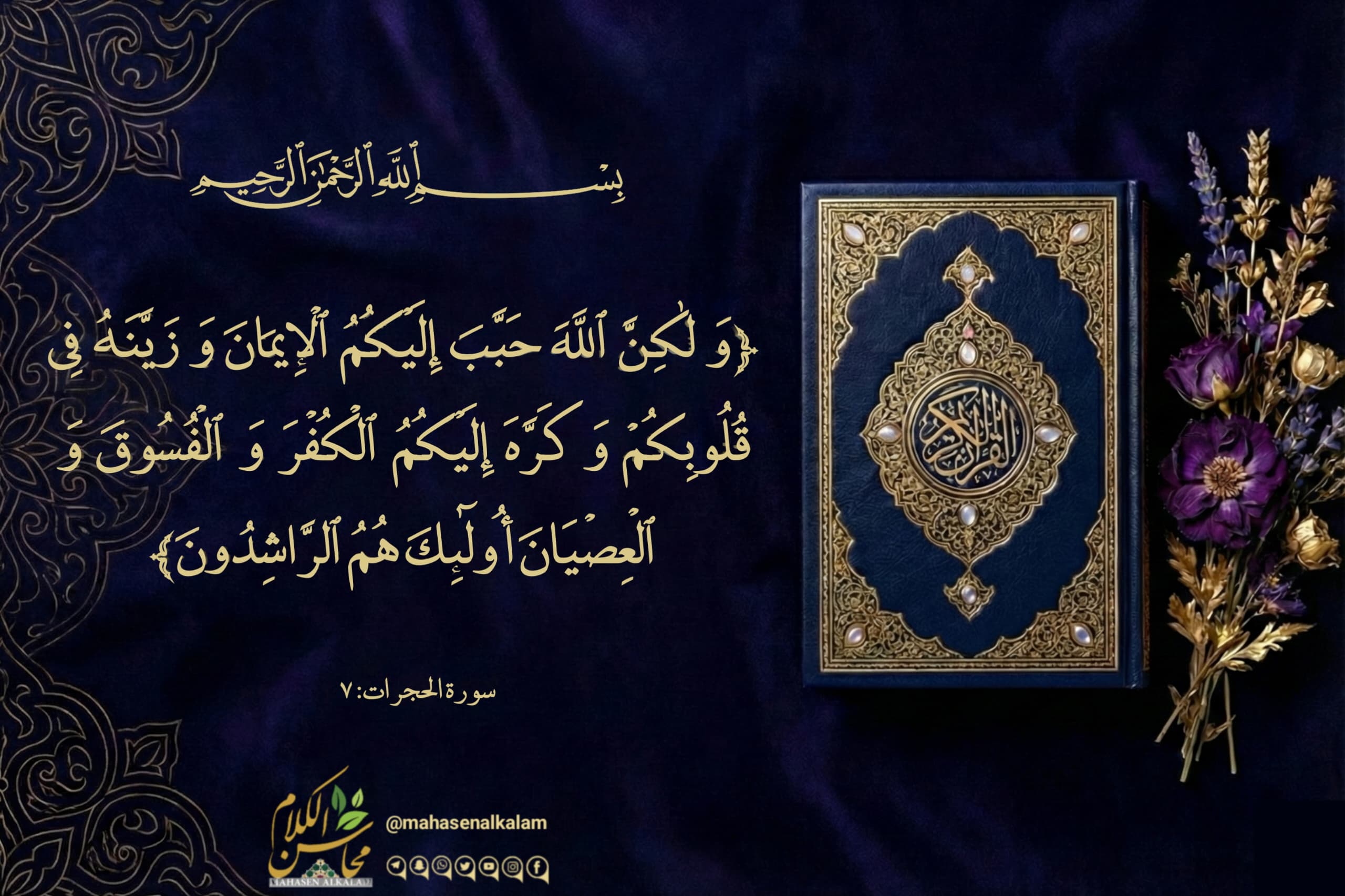و يشير القرآن معقّبا في الآية إلى موهبة عظيمة أخرى من مواهب اللّه سبحانه فيقول: وَ لٰكِنَّ اَللّٰهَ حَبَّبَ إِلَيْكُمُ اَلْإِيمٰانَ وَ زَيَّنَهُ فِي قُلُوبِكُمْ وَ كَرَّهَ إِلَيْكُمُ اَلْكُفْرَ وَ اَلْفُسُوقَ وَ اَلْعِصْيٰانَ .